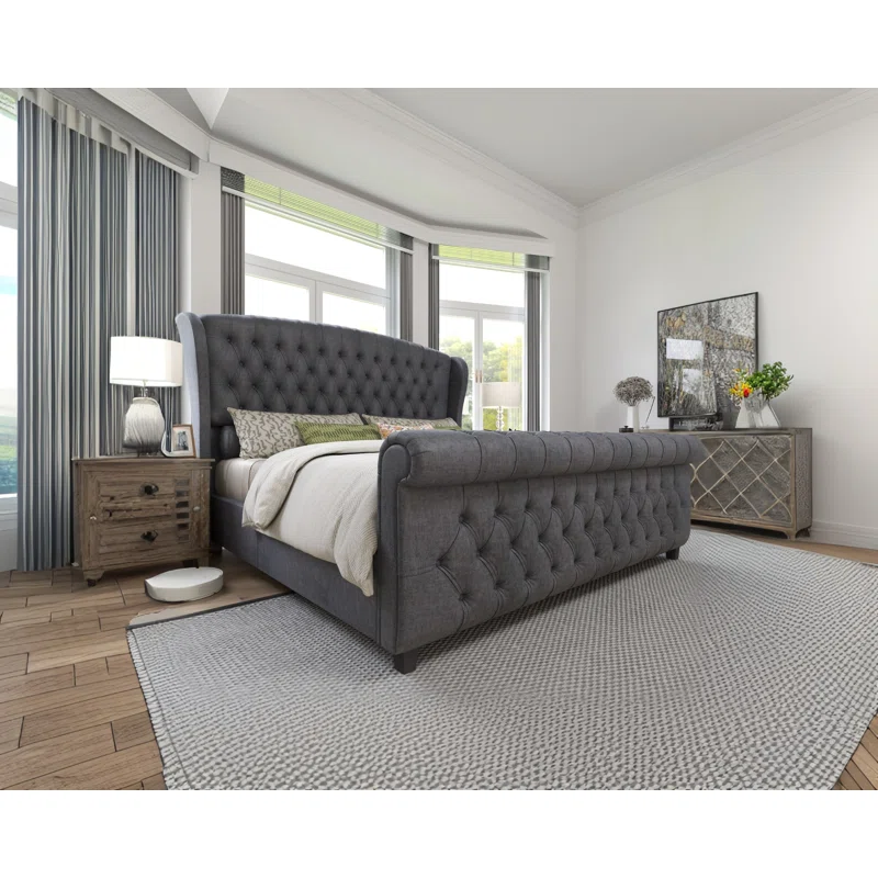 Transform your bedroom into a luxurious sleep sanctuary with PoshHouse’s low-profile sleigh bed. The elegantly curved headboard, upholstered in rich chenille fabric, is adorned with deep diamond-shaped button tufting, lending a sophisticated, timeless appeal. Crafted from engineered wood, this bed features 12 wooden slats and center support legs, providing a solid foundation without the need for a box spring. The foam-filled headboard offers an inviting, plush spot to lean back and relax, whether you’re reading or catching up on your favorite TV shows. With its fully upholstered frame and finished back, this bed seamlessly complements both glam and French country décor, making it a versatile choice for any bedroom.