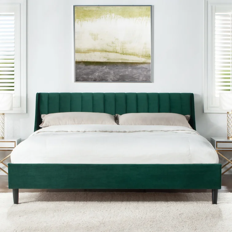 This luxe upholstered platform bed makes a bold statement with its eye-catching wingback design, dynamic curves, and a distinctive hue. The frame, made from kiln-dried solid wood and engineered wood, is wrapped in soft velvet, while vertical channel tufting adds a touch of sophistication. Foam-filled padding provides extra support, perfect for propping up with a book before bed. With its sturdy design and center legs, there’s no need for a box spring—simply add a mattress of your choice (sold separately).