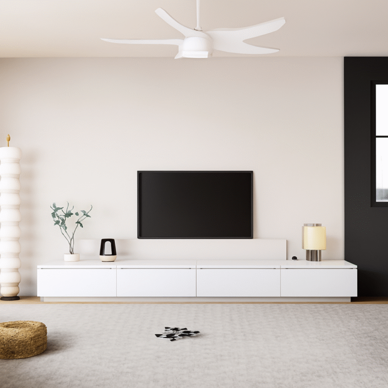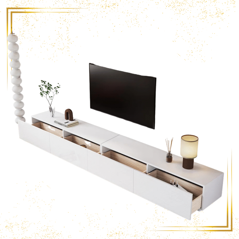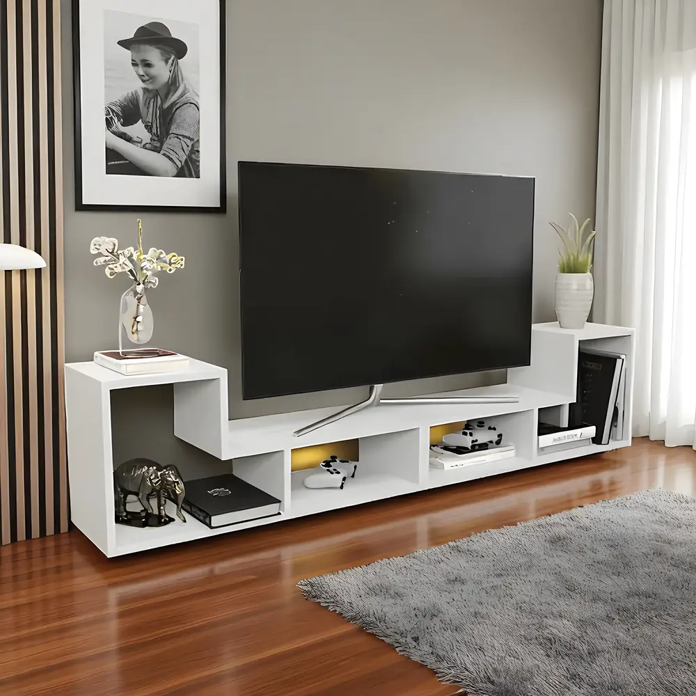 This modern TV Stand from PH Furniture combines sleek design with functional storage. Featuring a unique zig-zag structure, it offers multiple open shelves for books, décor, and media devices. The crisp white finish complements contemporary or minimalist interiors, while the open shelving ensures easy access and keeps your living space organized. Perfect for those looking to save space without compromising on style.