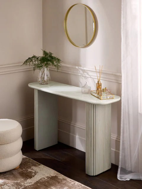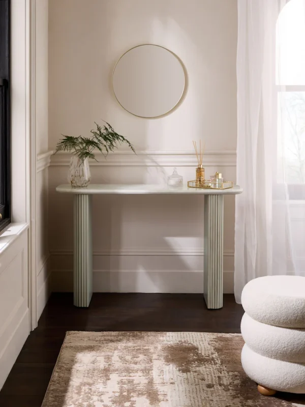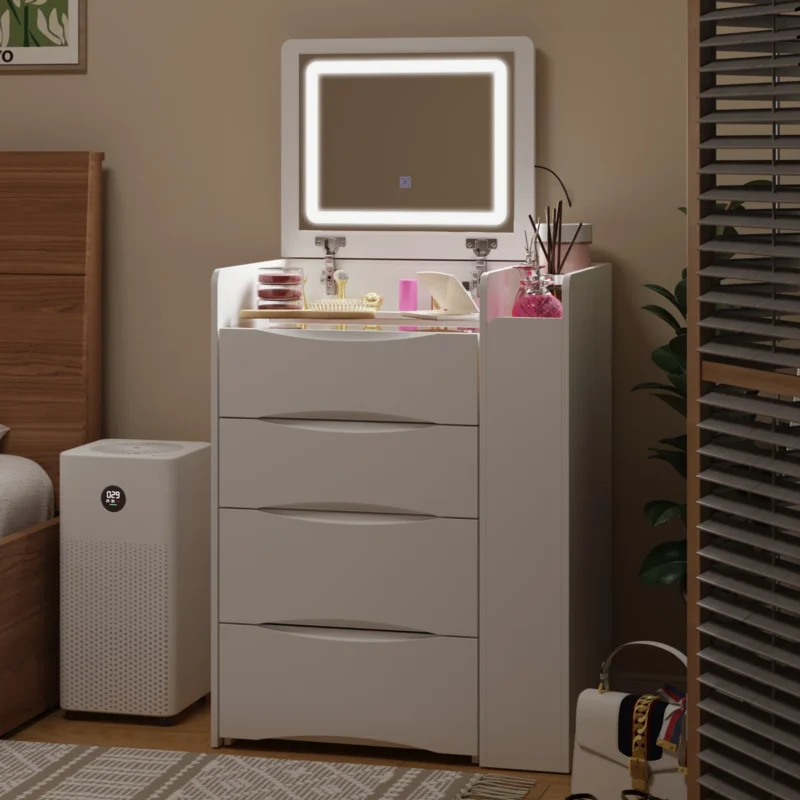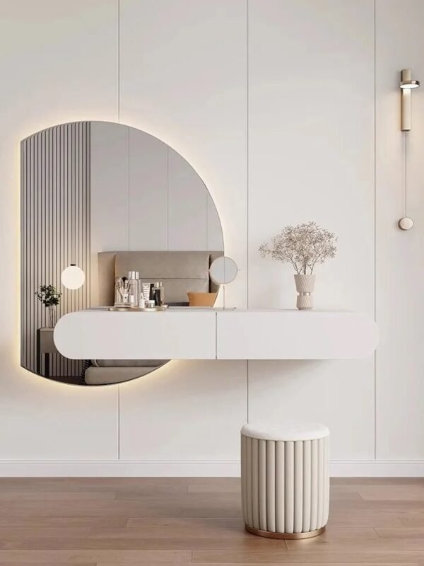 Redefine your bedroom with this elegant wall-mounted dressing table featuring a unique asymmetric mirror and a sleek storage compartment with subtle grooved detailing. Designed to maximize space, it blends functionality with minimalist sophistication—perfect for organizing makeup, accessories, or décor items. Its clean, floating design adds a contemporary touch, making it ideal for modern interiors. Ottoman not included.