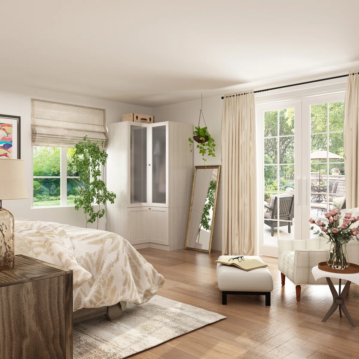 Optimize your room’s corner space with this stylish corner wardrobe from Posh House Furniture. Featuring a unique L-shaped design, this wardrobe fits perfectly into corners, maximizing storage without taking up extra floor area. The wood grain texture surface combined with frosted glass doors adds a modern, elegant touch while protecting your privacy by partially concealing the contents inside. Inside, a metal hanger rod and six open shelves provide ample space to organize your pants, shirts, jackets, and accessories neatly. Compact yet highly functional, this wardrobe is perfect for homes that value smart storage solutions.