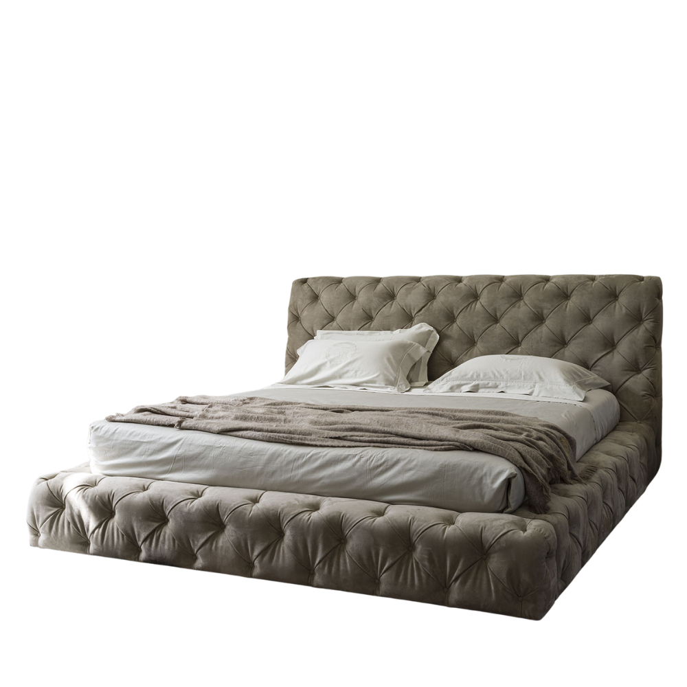 Indulge in plush serenity with this luxurious upholstered bed from PH Furniture, designed to bring timeless elegance and exceptional comfort to your bedroom. Wrapped in soft taupe gray velvet, it features a beautifully tufted headboard and elevated base that create an inviting centerpiece for any modern or contemporary retreat. Perfectly paired with minimalist decor and warm lighting, it transforms your space into a haven of refined relaxation.