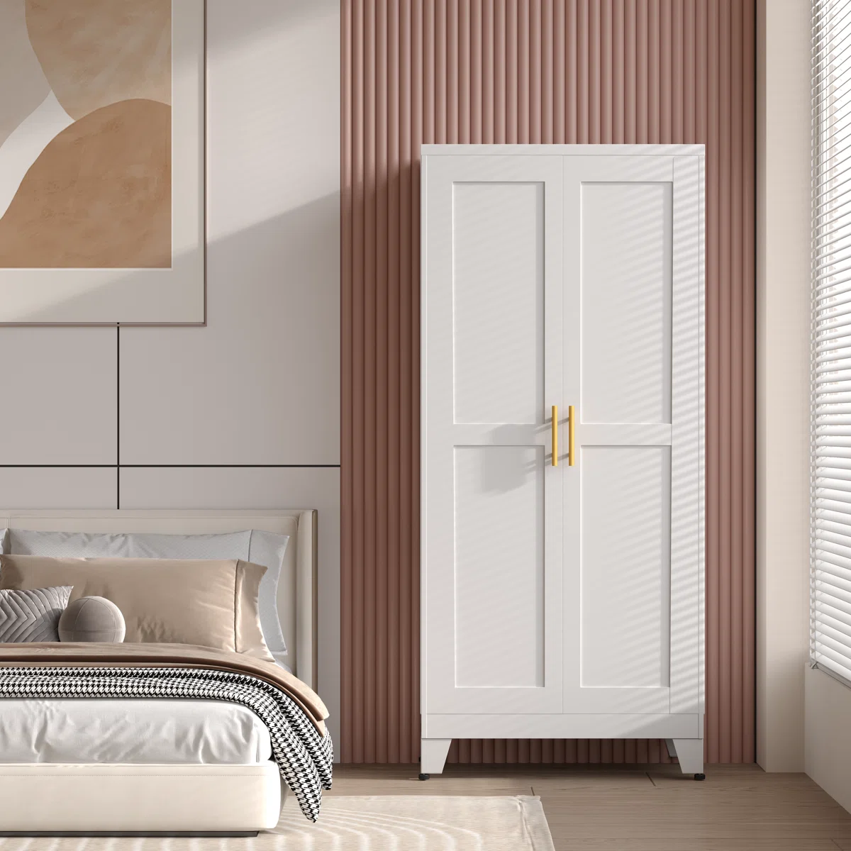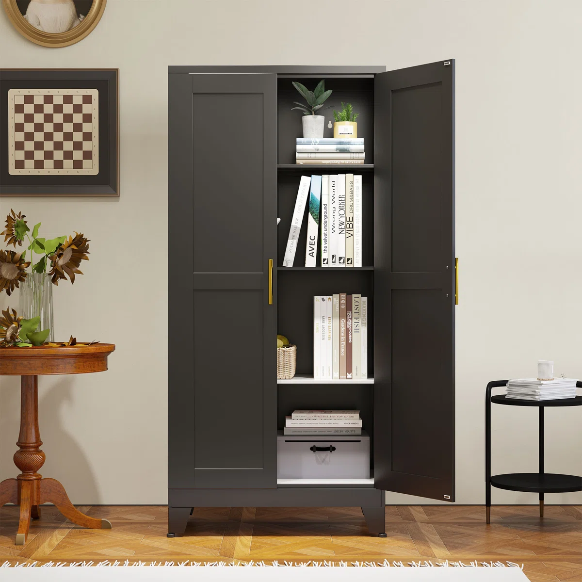 Maximize your storage with this multifunctional black steel cabinet from Posh House Furniture. Featuring 3 adjustable shelves, it offers 4 customizable storage spaces ideal for organizing clothes such as dresses, suits, and pants, or storing kitchen supplies, bathroom essentials, books, and files. Crafted from large, thickened cold-rolled steel plates with a reinforced structure, this freestanding cabinet is sturdy and durable. The electrostatic powder-coated finish makes it scratch-resistant, wear-resistant, and easy to clean. Adjustable feet ensure stability and help prevent tip-over accidents, providing safety and peace of mind.